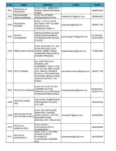 8765 PEELA NAGA TULASI NAGAR, MARRI PALEM, nagatulasipeela@gmail.com 7794976526